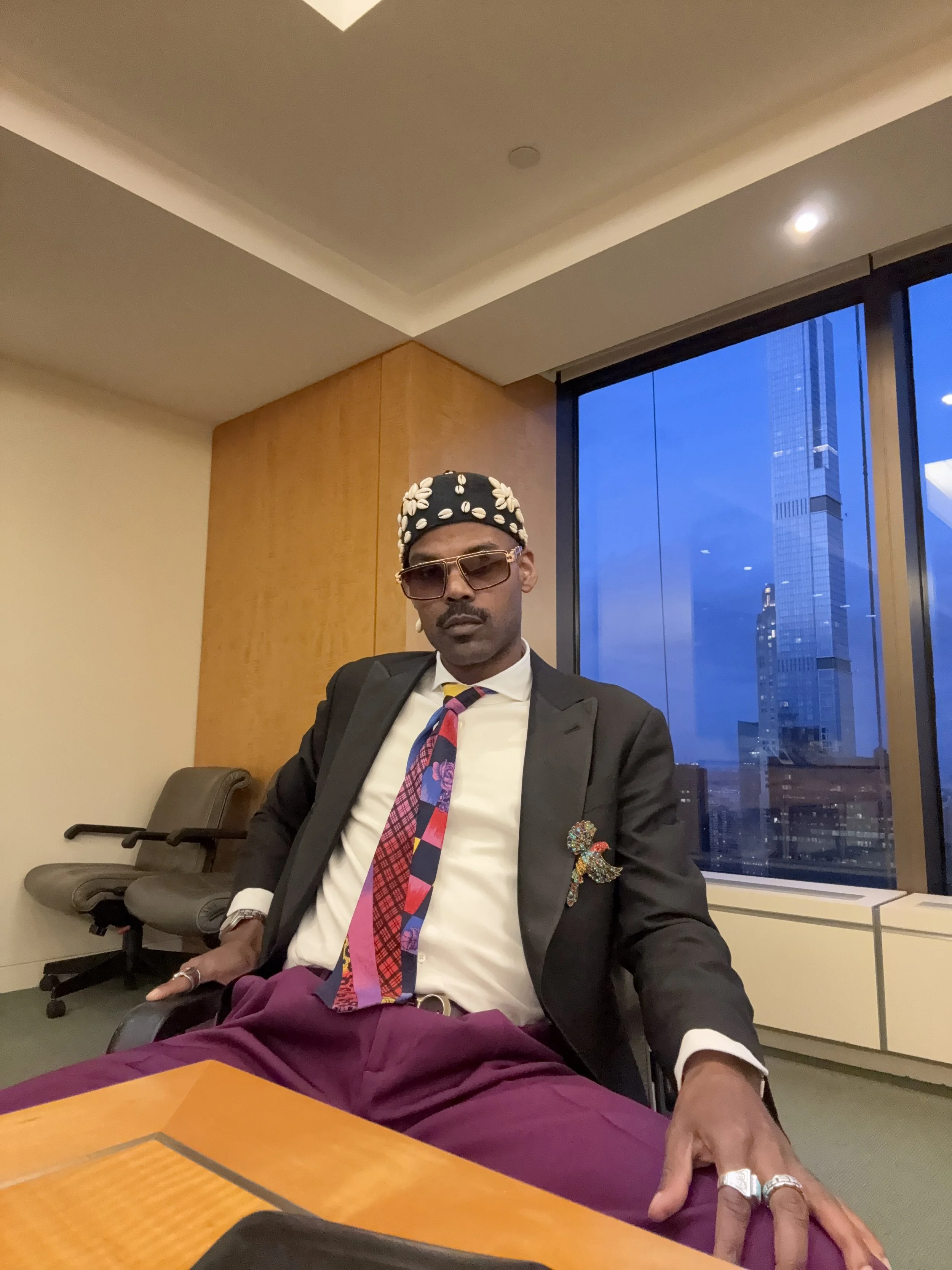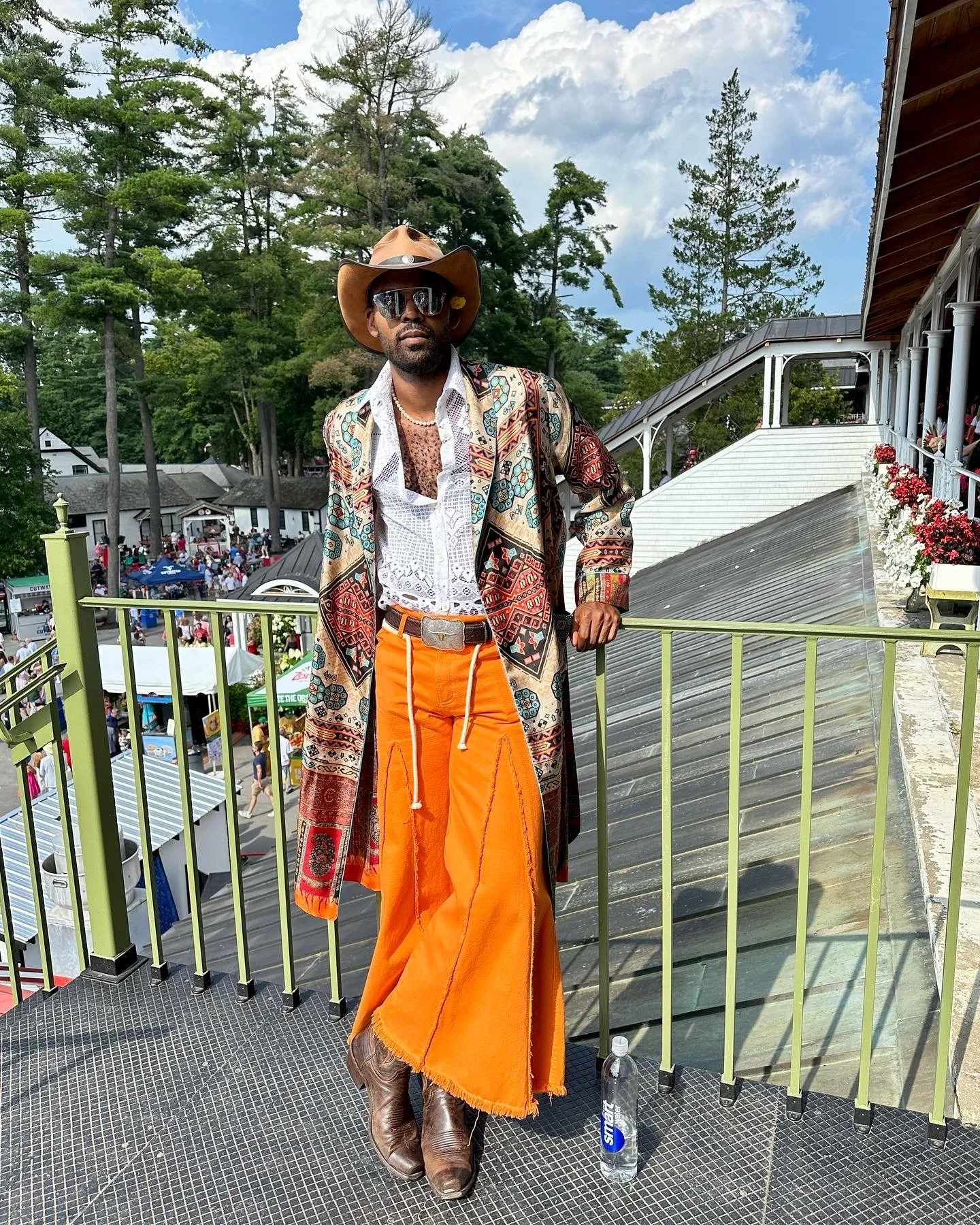 Sartorial Dandy Flair. I’m no stranger to drama and flair. My mother, a serial watcher of shows like the Young and the Restless and Bridgerton, passed down her love for ornate fashion, which I picked up on countless shopping trips. Perusing the racks at Neiman Marcus, Saks, the outlet mall and whichever other stores she visited, I studied the fabrics, cuts, and patterns, how the music complemented the shopping experience, and how the mannequins were styled. In my last few months of New York, I started capturing the styles of the living mannequin I’d become in a sartorial self-portrait series — weaving together fabrics, patterns, colors and cultural elements in an avant garde style akin to Ike Ude, though I only learned of him after my visit to Superfine: Tailoring Black Style exhibit at the Met later that year. Each outfit became a performance — an ode to my own self-determination, beauty, and the interconnectedness of global style. My interior mirrors this regal flair: baroque gold vanities, oversized lamps, crane side tables, and art covered walls. The flair contributes to the overall fabulousness that makes the Chic Cowboy uniquely chic.